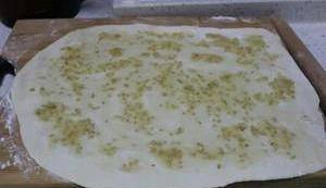 撒上幹面,將面搟成薄片。均勻塗抹上油酥。