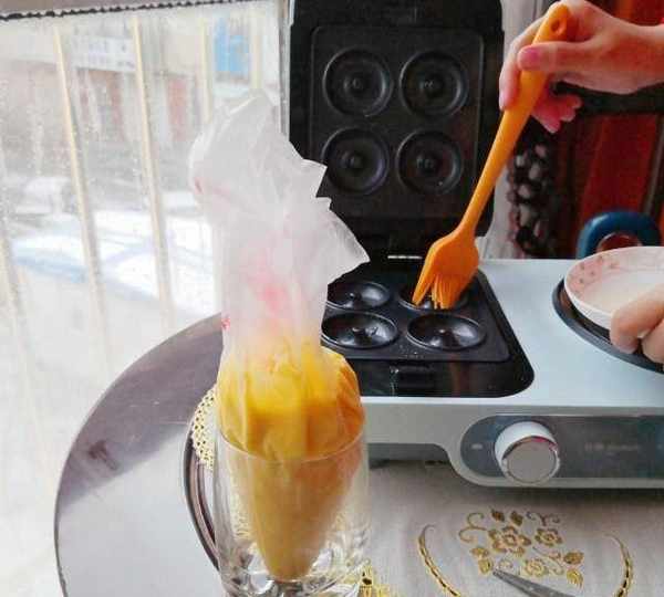 第5步、將拌好的面糊裝入裱花袋裡,甜甜圈烤盤需要刷油防粘。