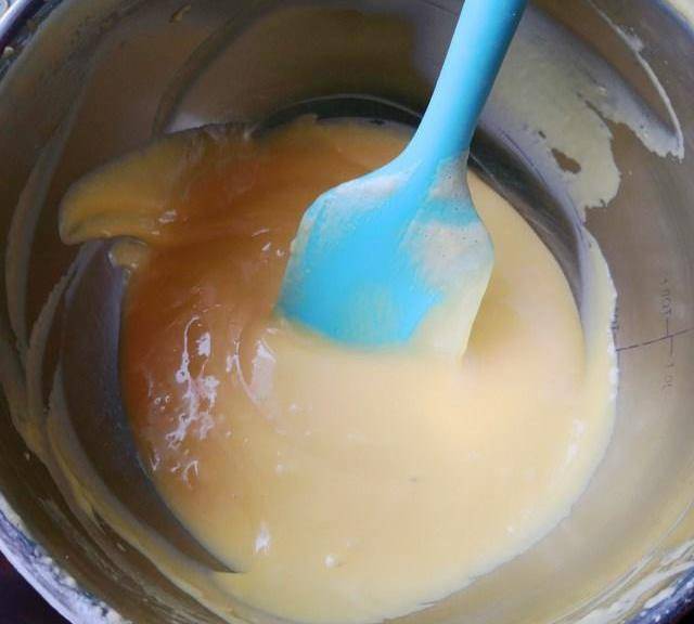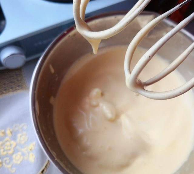 第3步、蛋液打發好後顏色會變淺,而且提起打蛋器,滴落下來的蛋液落在蛋液糊裡久久不會消失。