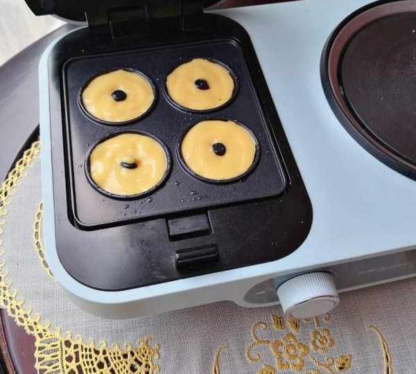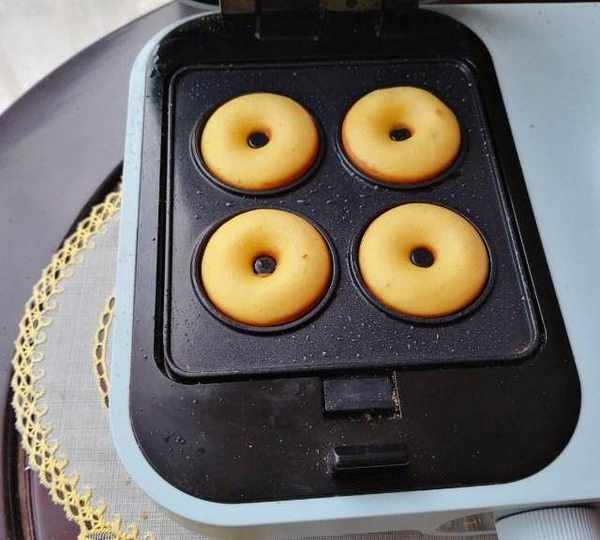 第7步、蓋上蓋子,時間選定5分鐘,時間到打開蓋子,甜甜圈就做好瞭。