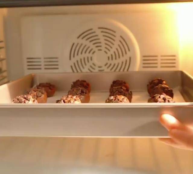 第9步、剛烤好的曲奇餅幹先不管它,多放一會,表層的巧克力豆吃起。