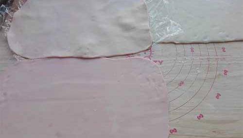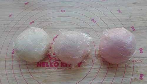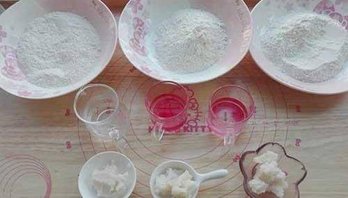 1、中筋面粉、糖、豬油54克,平均分成三等份;將水也分成三等份,水中滴入不同程度的色素,分成無色、淺粉和深粉。將三等份的食材和水,混合在一起,分別揉成光滑的油皮面團,分成無色、淺粉色、深粉色三個油皮面團。將三個油皮面團上蓋上保鮮膜,放在一旁醒發一段時間。