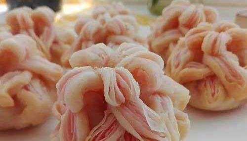 6、取一個圓形的面片,放上自己喜歡吃的餡料,收起口包裹好,捏出五邊形的樣子。用剪刀將五個邊剪一下,然後向中間按下去。將五個剪開的邊向中間折,再壓一下。然後將下面在剪一刀,每個的第一條同相鄰的第二條兩兩捏起來,一個花胚就做好瞭。將所有的面皮,都這樣做好。鍋中放入適量的油,將花胚放進去,小火慢慢炸就可以瞭。
