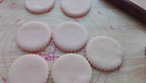 5、將三張面片上刷上一層薄薄的水,按照由淺到深的順序摞起來。將摞好的長方形面片,用圓形切模工具將其切出6-7個圓形面片,沒有切模工具可能借助碗或者杯子來摳出圓形。