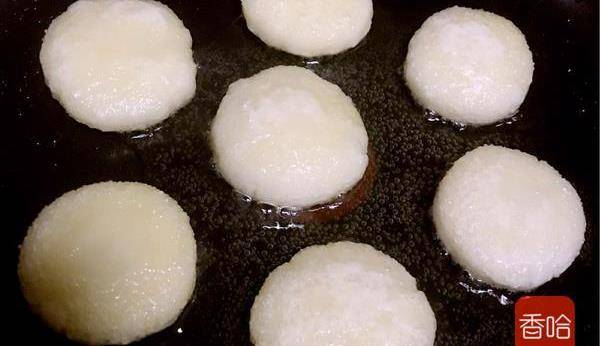 4.鍋內放入適量油、把搓圓的粉團壓扁放入不沾鍋小火煎至兩面淡金黃。