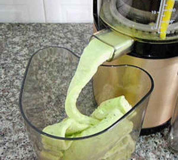 第8步、做好的純水果冰淇淋就會從原汁機的出渣口擠出,制作完成後用冰淇淋勺挖取即可。