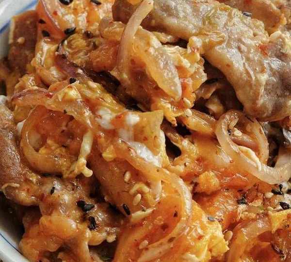 肥牛卷、洋蔥、辣白菜、食用油、生抽、鹽、韓式辣醬、番茄醬、白糖、玉米淀粉、海苔、小蔥花
