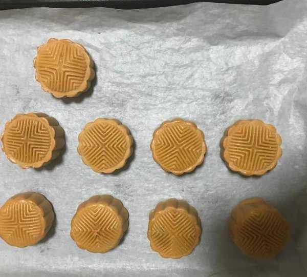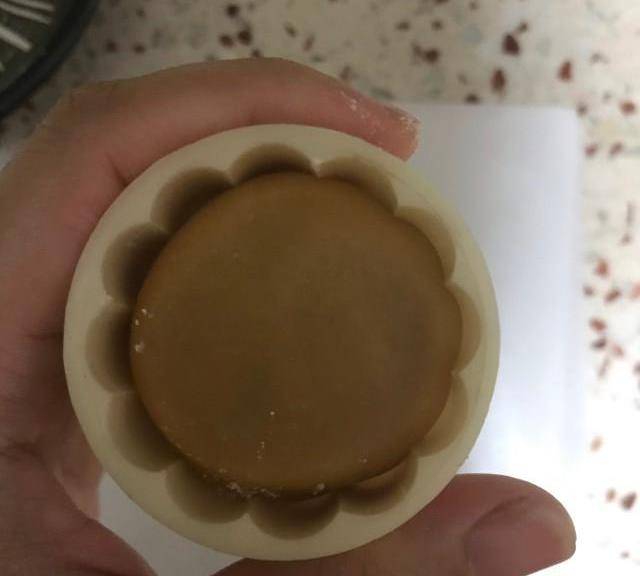 第13步、粘一些幹面粉,然後放入50g的月餅模具,壓成型。