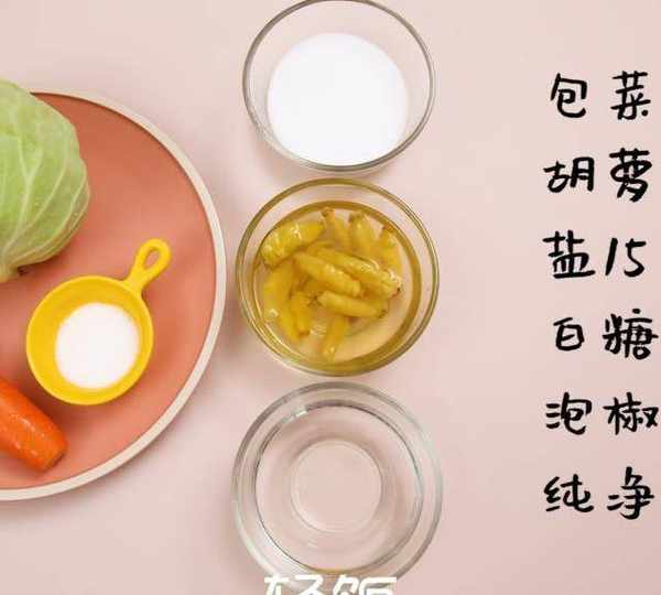 原料:包菜、胡蘿卜、泡椒水、米醋、白糖、涼白開、鹽。