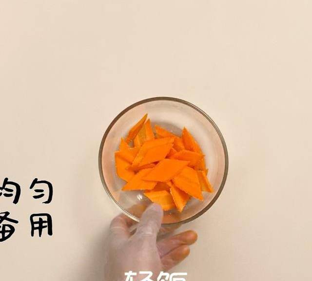 第4步、胡蘿卜去皮,切成菱形小片,加入3克鹽殺水備用。