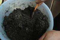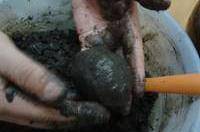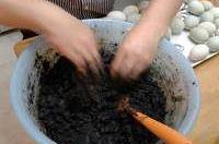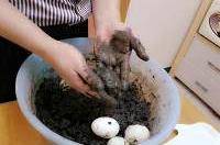 5.和泥。將煮開的鹽水降一下溫,倒進盛有生石灰、堿面、草木灰混合物的盆中,攪拌成粘糊的泥狀。