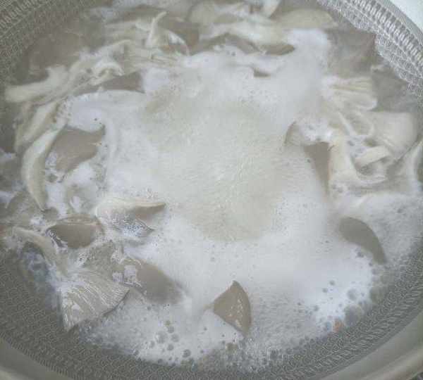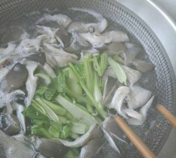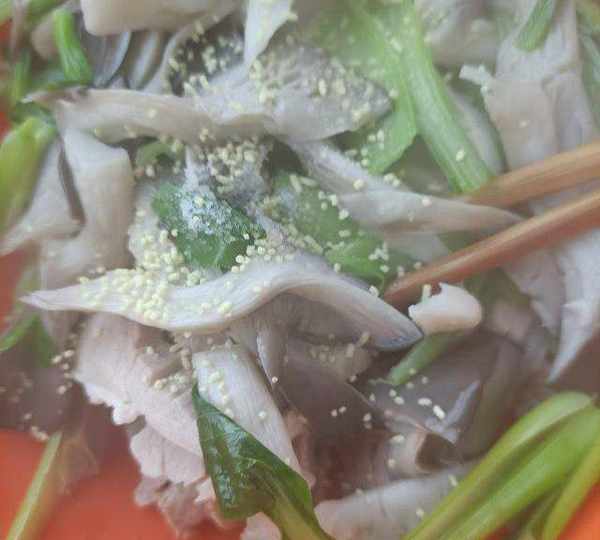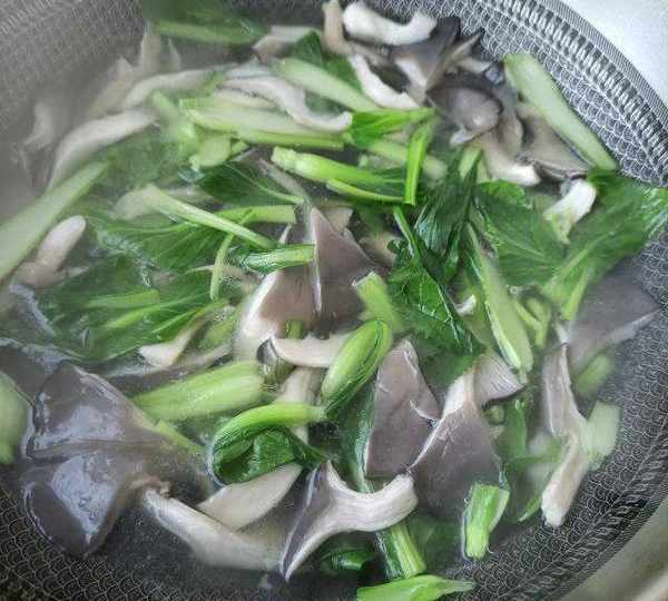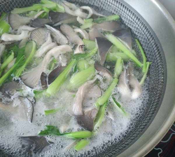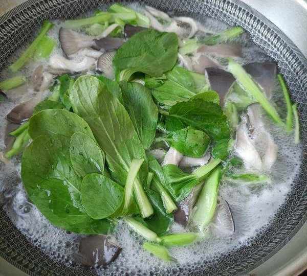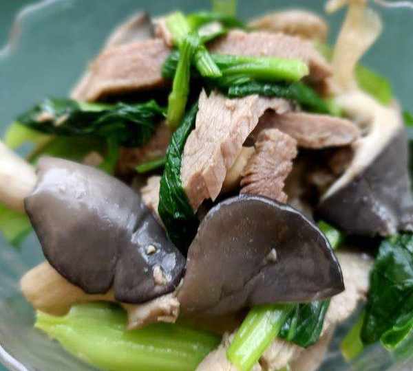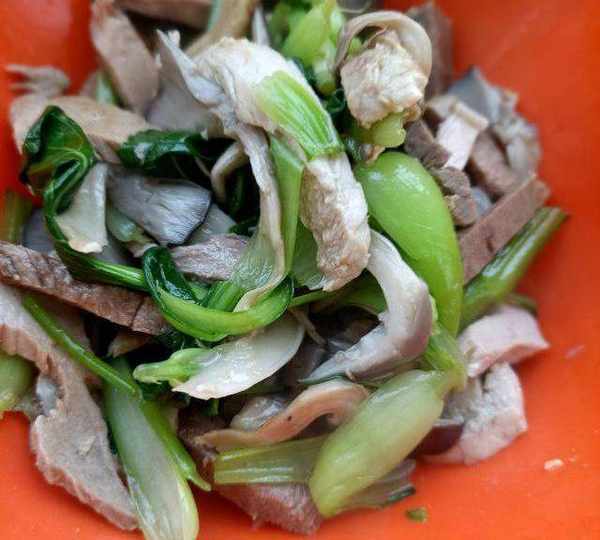 原料:平菇、熟精肉、雞毛菜、食鹽、生抽、雞精、香油。