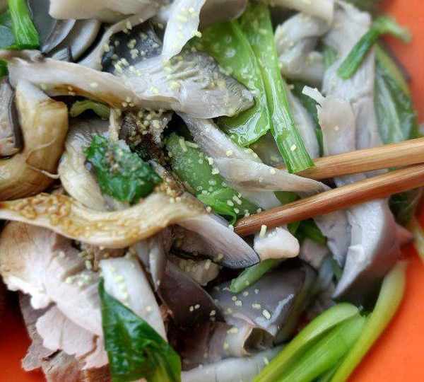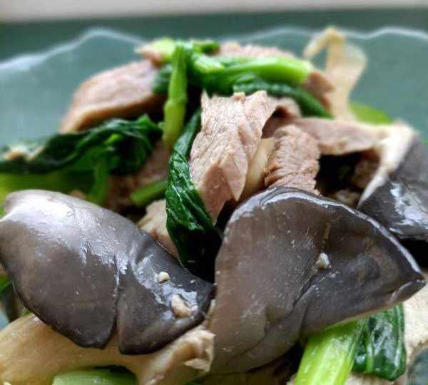 煮的精肉用來做拌菜真的太方便啦。早起先去市場買瞭斤平菇和一把油菜,這種油菜不是上海青哦,是雞毛菜,不過我們當地人自己種的這種菜,當地人都叫做油菜。
