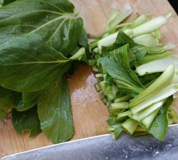 第3步、洗凈雞毛菜切開,莖葉分開。