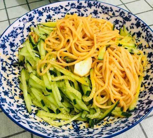 原料:面條、青瓜、調味汁配方:、大蒜、鹽、白糖、味精、生抽、陳醋、現炸花椒油、油潑辣子。