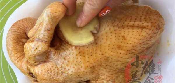 2.準備一隻處理幹凈的小雞,向雞肉裡外面先刷上剛才準備好的醬汁,再幫它按摩更加入味。隨後,在雞上放入幾個薑片。