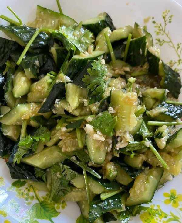 這第四道拍黃瓜就更接地氣瞭,看著賣相就知道味道差不瞭。黃瓜翠綠,水分很足,加上多多的蒜末,蒜香味濃鬱,夏天吃這菜最開胃瞭。