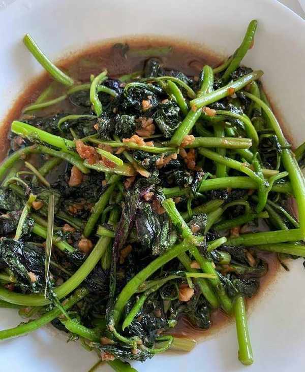 這第一道菜,比較有爭議,有的說是莧菜,還有的說是茼蒿,也有網友說是紅薯葉,具體是什麼,還真不好說。不過雖然看不出具體食材,但是看著味道還不錯,一道素菜炒出瞭葷菜的感覺,特別有食欲。