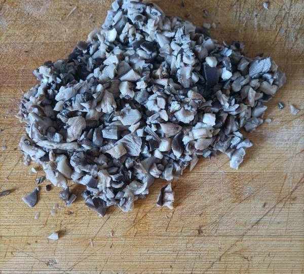 第6步、將平菇碎、油豆腐碎和蔥末分別裝入盤中。