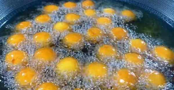 3、鍋中加入適量的食用油,燒至四成熱,用筷子放進去,迅速冒小泡,然後把火調到最小,接著將丸子生胚一個個的下入,炸至一分鐘之後,然後用個鏟子沿著鍋邊輕輕的給它推動一下,防止它粘連到一塊,一直炸至所有的丸子全部都漂浮起來的時候,把火調成中火,炸制所有的紅薯丸子表面顏色金黃酥脆,就可以撈出控油瞭。