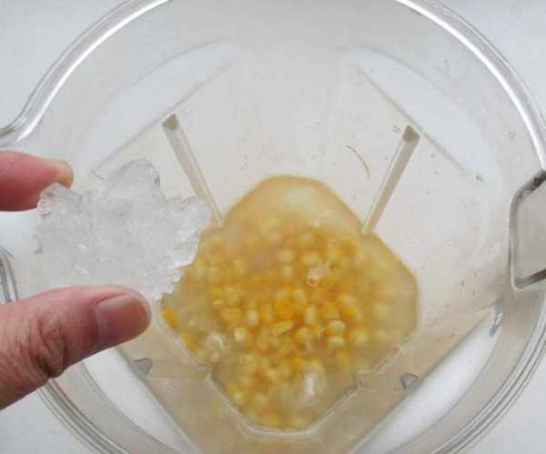 6將放至溫熱的玉米銀耳連同湯汁一起倒入料理杯中,加入適量冰糖。