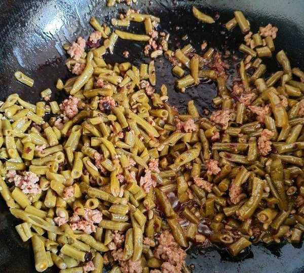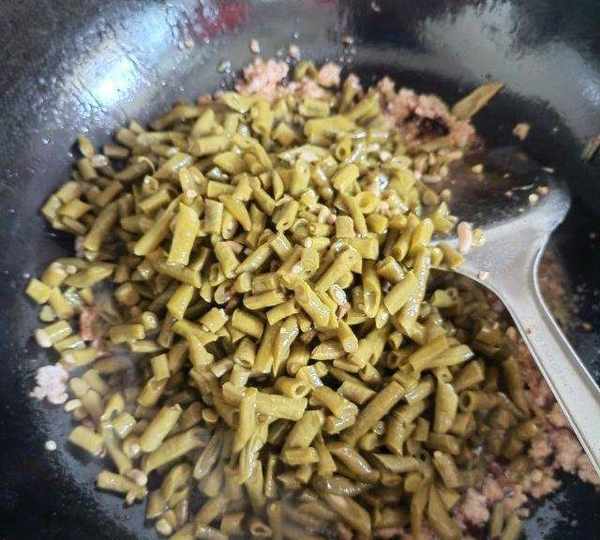 第4步、加入泡好的豇豆節翻炒。