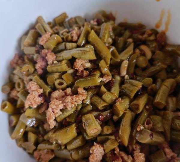原料:泡豇豆、爛肉、蔥花、薑銳、老幹媽、油。