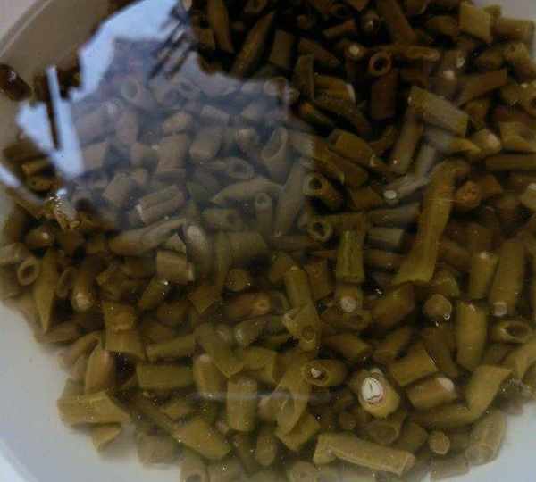 第1步、泡豇豆是四川的泡菜之一,比較酸和咸,所以先切成短節,用清水泡30分鐘,泡出一些酸味和鹽。