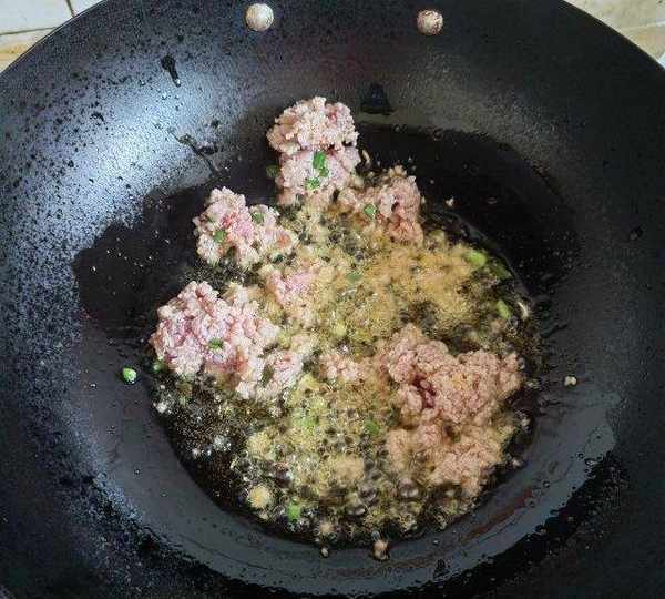 第2步、油熱以後,放入爛肉,蔥花,薑碎翻炒。