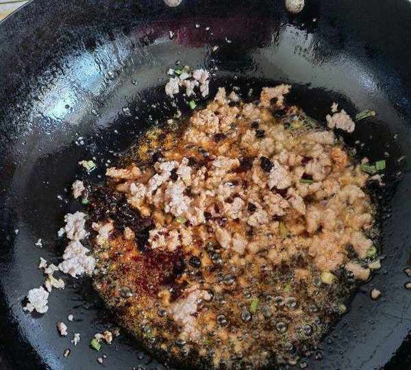 第3步、爛肉炒散以後,放入老幹媽翻炒均勻。