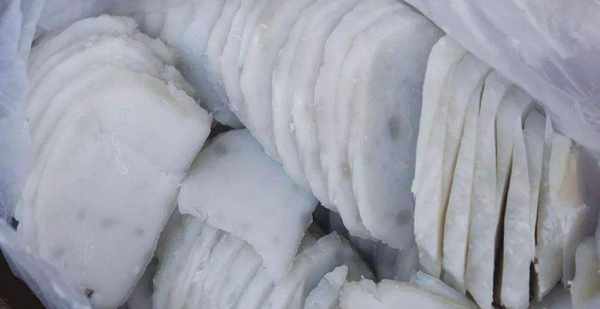 把淀粉糊放到一個比較大的容器裡面,再加入和之前淀粉差不多量的淀粉,然後揉搓均勻,像和面一樣做成一個淀粉團。最後把淀粉團搓成一條比較粗的長條,用大火蒸半個小時。半個小時過後,淀粉腸基本上就蒸好瞭。然後把它晾一晾,等到溫度降下來瞭,就把淀粉條切成一片一片的。註意不要切成薄厚均勻的,要用滾刀切,切成一邊厚一邊薄。然後就可以拿來用油煎瞭,傳統的做法是要用豬網油,用的是豬肥腸上面的油,而不是一般的豬油。油煎的時候把平底鍋稍微放斜一點,先把淀粉片放在低的地方,這裡油比較多,可以看作是油炸,稍稍炸過之後移到高的地方,這裡油少,慢慢煎熟。這樣做出來一片上面兩種口感,蘸上蒜泥非常好吃。