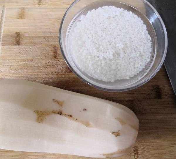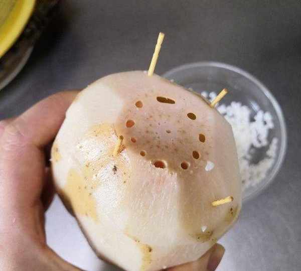 第3步、泡好的糯米利用筷子,慢慢戳進它們小孔。