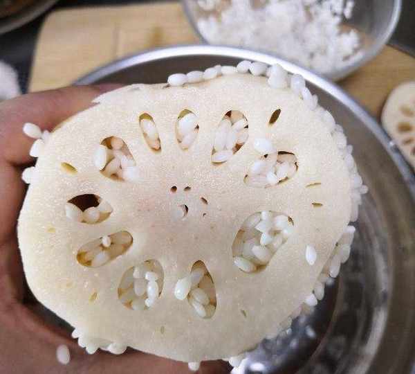 原料:藕、糯米、紅糖、蓮子、糖桂花、枸杞、水淀粉。