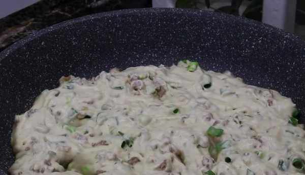 再切點蒜末也放到肉餡裡,下面起鍋燒油,油熱後。倒入蒜末、薑末和肉餡炒香,炒好之後倒入這個料汁。再繼續翻炒炒出醬香味,炒出醬香味,關火備用。面發好以後,把炒好的肉餡放進發好的面裡,用筷子攪拌均勻,攪勻後再放入一些小蔥碎,再次攪勻,一定要充分攪勻才好吃。下面不開火先刷點油,倒一半攪好的面糊在鍋裡面。