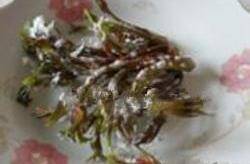 9.去掉根的香椿放在盤子中,在香椿表面均勻的撒一層幹面粉。