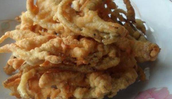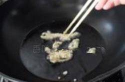 12.用筷子夾著裹好脆皮漿的香椿,放在油鍋中,筷子不離香椿中火炸制。