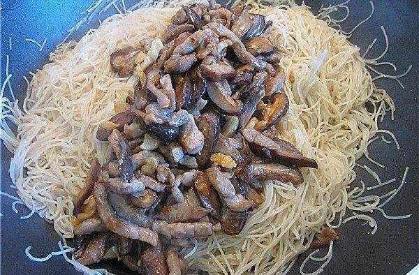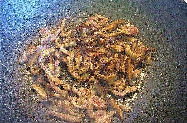 6.倒入少許生抽、白糖、鹽、翻炒均勻將剛才炒好的肉絲與冬菇絲加入翻炒。