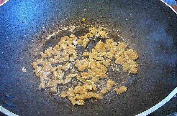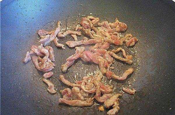 3.繼續使用原來的油鍋倒入肉絲翻炒。