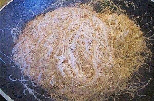 5.鍋裡需倒入比平常炒菜多的橄欖油,將米粉倒入用筷子翻炒。