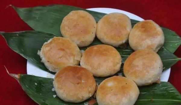 食材:面粉2500克,火腿丁300克,白糖500克,豆沙500克,鮮豬肉500克,食鹽300克,蔥花30克,醬油20克,豬油3500克。