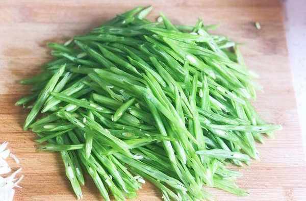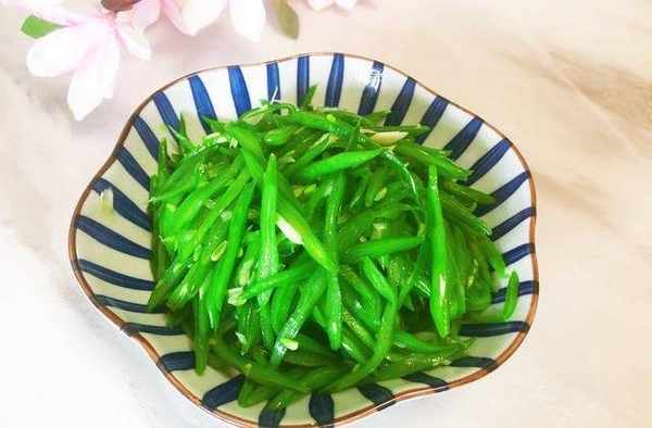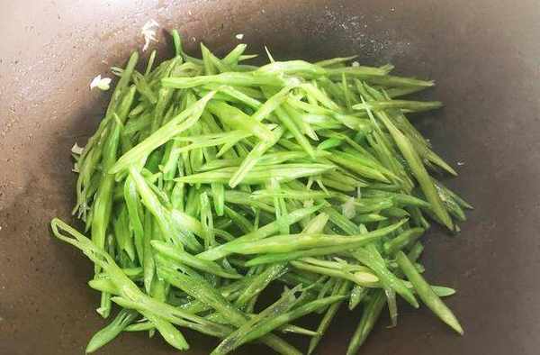 1、豆角挑洗幹凈,切成這樣的細絲,因為要卷餅,所以最好切得細一些。