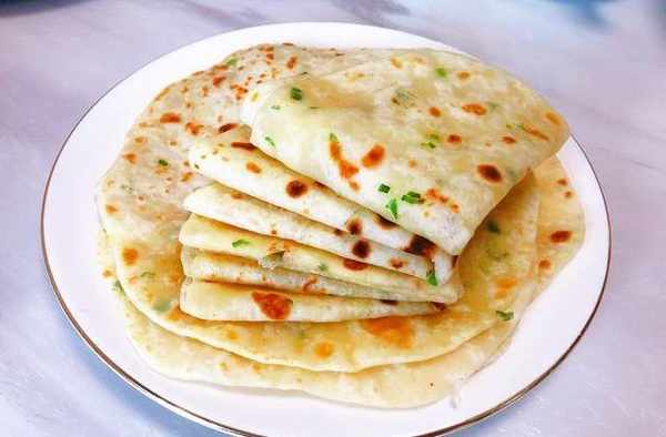 6、烙熟瞭以後,把餅拿出來,放在盤裡。