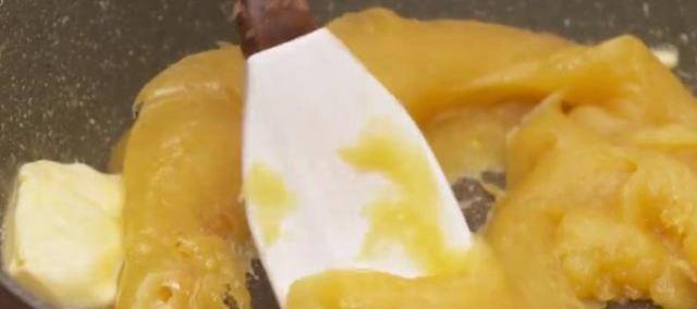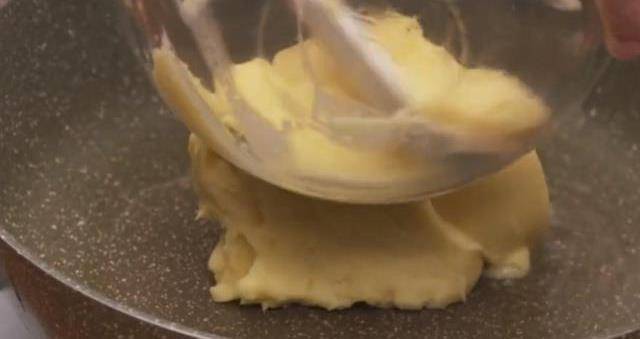 4、繼續翻炒,不要因為面糊是濕軟的就不炒瞭。吵到最後。他可以有點拉絲的狀態,就是稍微攪動一下,他就會整體不能炒的太幹,太幹就全部是沙。接著加入黃油。以有效的取代掉綠豆裡面微微的枯萎。這個時候就可以關掉火,將黃油加進去攪拌均勻,將他們攪拌均勻之後。是炒制完成希爾新藥,等到冷卻之後才能使用。