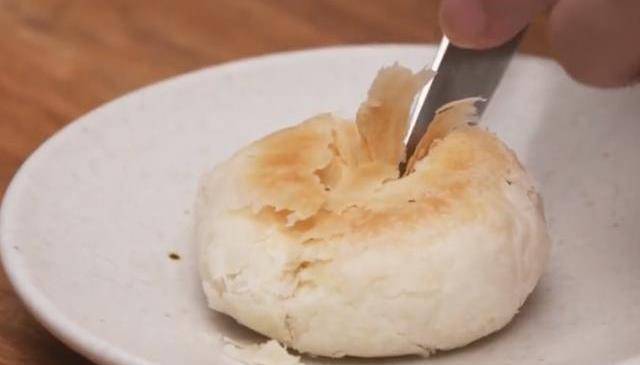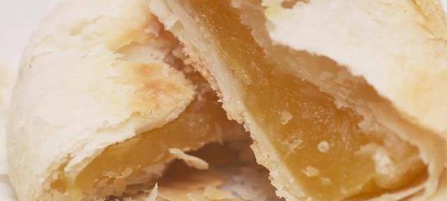 9、全部包好之後,再次將它從中間搟開,搟成一個不用太大的餅皮,然後包入綠豆餡兒,綠豆餡兒和餅皮的比例差不多是1:1,這樣做出來的綠豆酥皮薄餡大,然後用虎口收口法將它收攏,用虎口的力量可以將它收得均勻,然後在案板上滾一下,滾圓後稍微按扁。