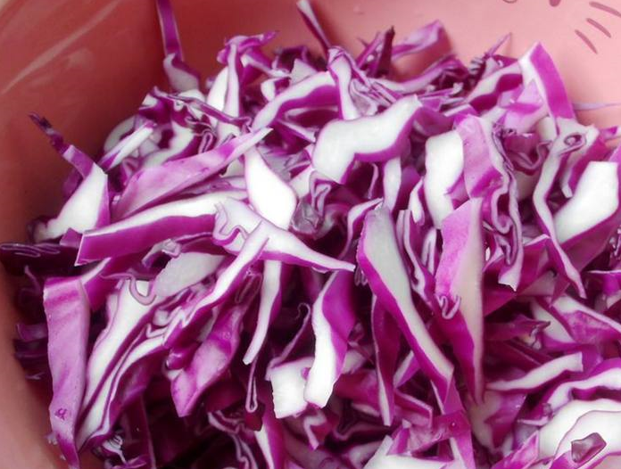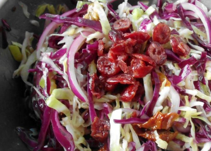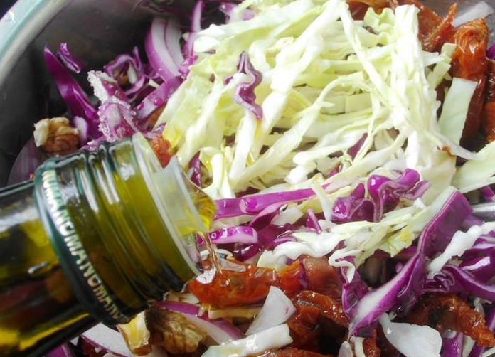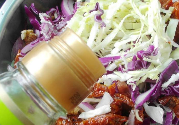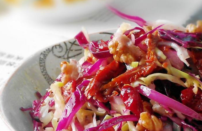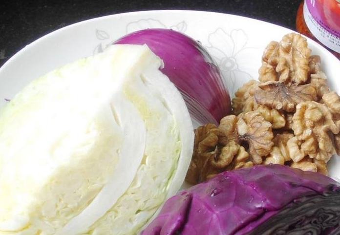 材料:圓白菜1/5個、紫包菜1/5個、洋蔥1/5個、核桃50克、油浸幹番茄30克、蔓越莓幹10克、鹽適量、橄欖油2湯匙、蘋果醋1勺、白糖少許
