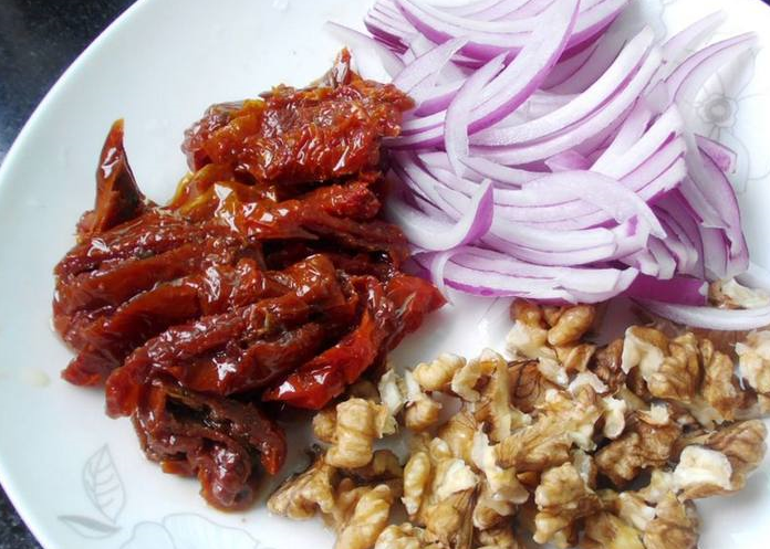 4.洋蔥切絲;核桃掰小塊;幹番茄切小塊;