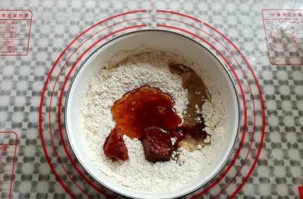 第五步:加入蜂蜜、玉米油、南乳豆腐和南乳汁,想要雞仔餅顏色深一點,可以多放一點南乳汁。南乳豆腐也叫紅腐乳,超市裡有賣。