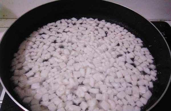 第一步:制作冰肉,選擇肥的豬肉切成花生米大小,放入熱水中煮幾分鐘,去除油膩感。肥肉不用特意去買,每次煮菜時候把豬肉上的肥肉切出來,放冰箱裡攢幾天就可以做冰肉瞭。