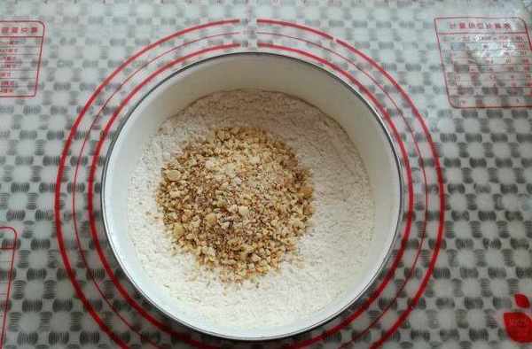 第四步:面粉裡加入鹽、白胡椒粉、白砂糖和小蘇打粉簡單混合,再加入搟碎的花生和白芝麻。