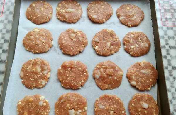 第八步:取適量的面團,揉圓後按扁,放入墊瞭油紙的烤盤裡,這裡一共做瞭兩盤。預熱烤箱上火150℃下火170℃10分鐘。